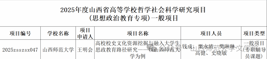 近日,山西省教育厅公布了2025年度山西省高等学校哲学社会科学研究项目(思想政治教育专项)立项名单,我院专职辅导员王明会申报项目《高校校史文化资源挖掘与融入大学生思政教育路径研究--以山西师范大学为例》成功获批一般项目。