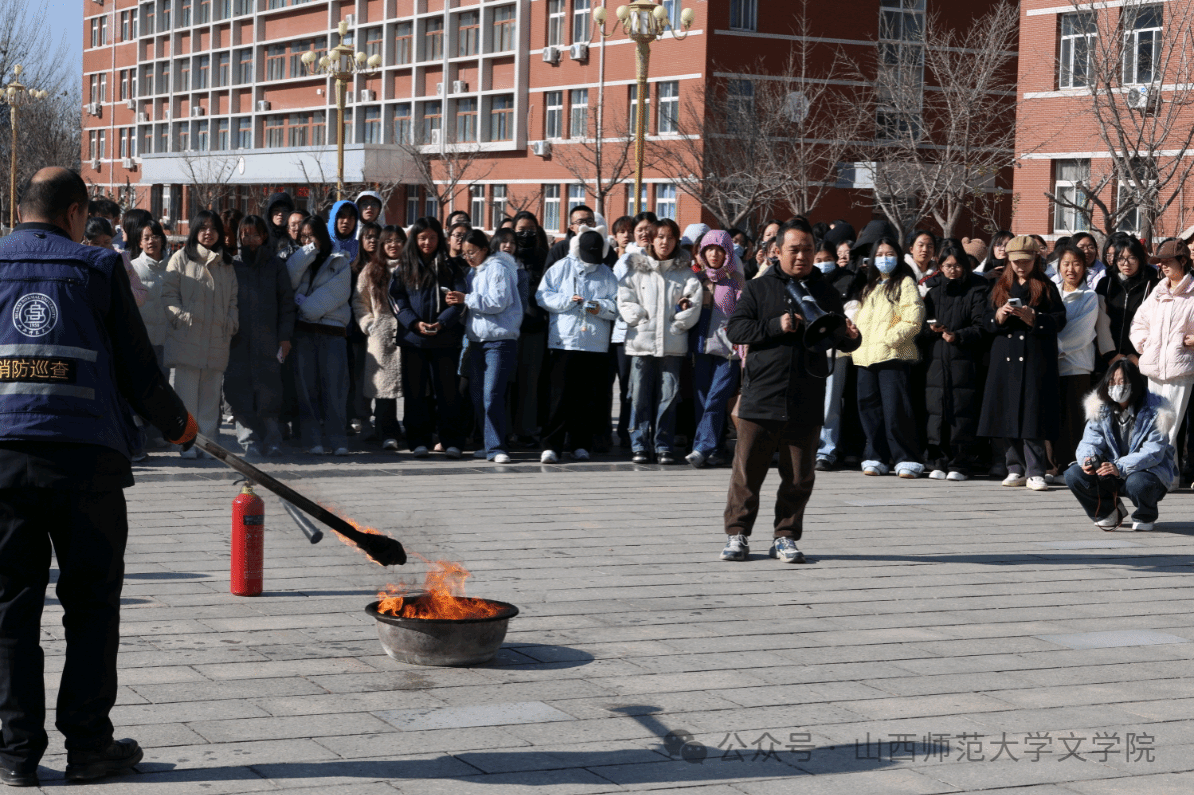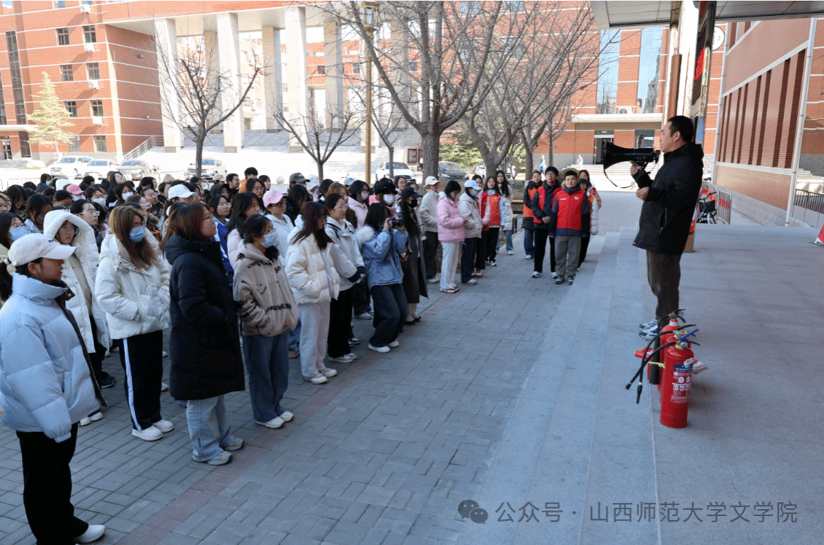 11月18日,文学院团委学生会权益身健部于3号楼前组织2025级新生开展消防应急疏散演练及灭火器演练,文学院专职辅导员、保卫部老师出席了此次活动,文学院师生200余人参加。