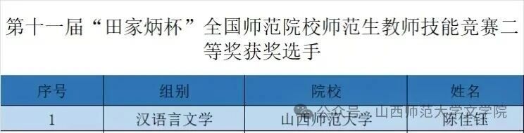 近日,第十一届“田家炳杯”全国师范院校师范生教学技能竞赛成绩公布,我院陈佳钰同学在临汾一中韩淑华老师的指导下,凭借扎实的教学功底与出色的现场表现,荣获汉语言文学组二等奖。