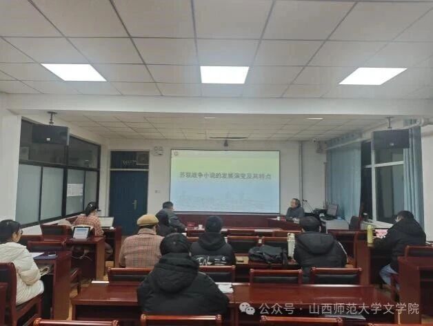 12月7日晚,文学院特邀天津师范大学文学院教授、博士生导师,俄罗斯国立圣彼得堡大学访问学者,诗人、翻译家曾思艺,于2201会议室作题为“苏联战争小说的发展演变及其特点”的学术讲座。讲座由高超老师主持,部分研究生到场聆听。