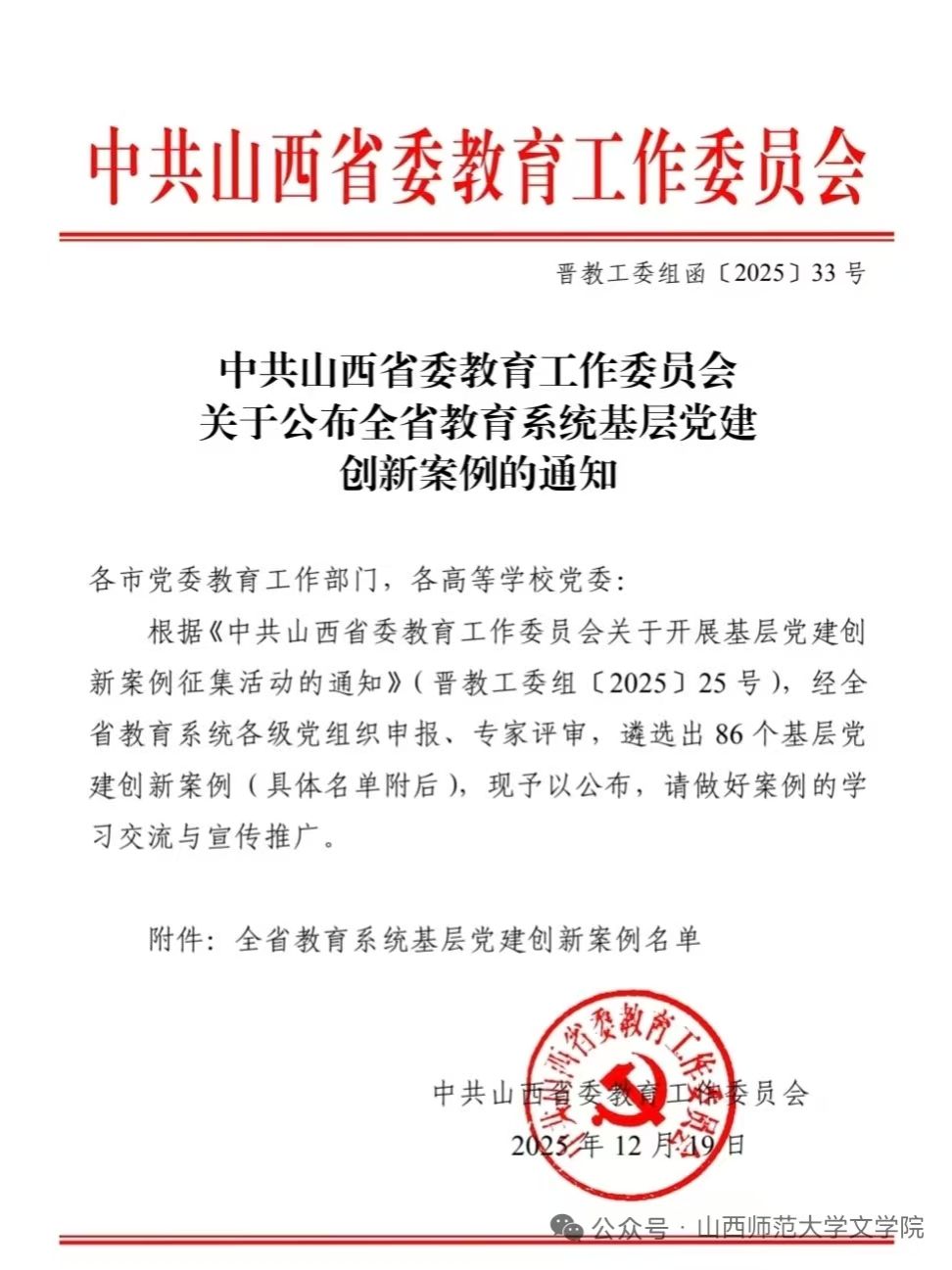 近日,中共山西省委教育工作委员会公示了全省教育系统基层党建创新案例名单,我院申报的“秉红烛初心 强党建引领 育时代新人” 案例成功入选,充分展现了文学院在基层党建创新工作的创新思路与探索精神。